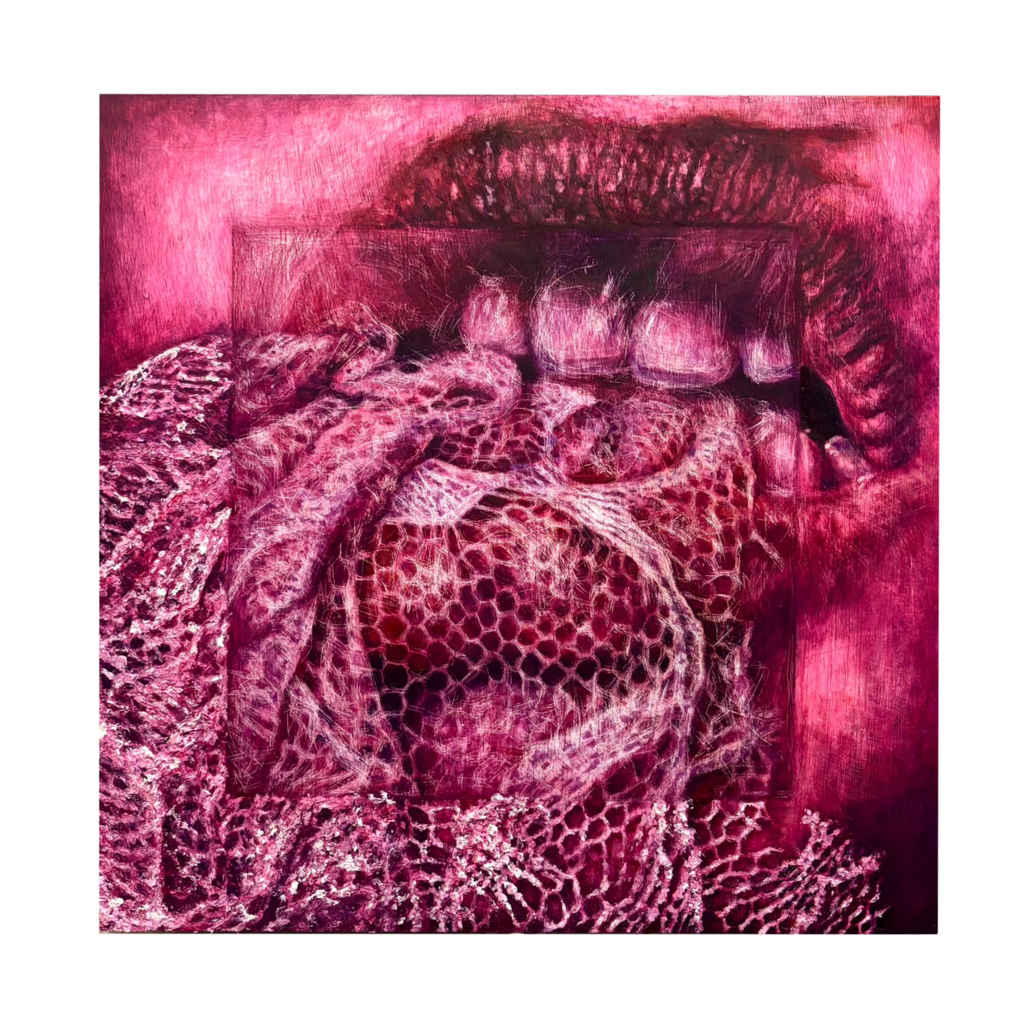 Vibrantly pink, red-lipsticked lips tear into pink lace. The outside of the image remains in thickly painted detail and is even 3-dimensional, with the pink lace being built up through layers of gouache and oil paint. The inside, however, is blurry and scratched away, a reflection of the vigor of the emotion and movement, as well as a commentary on voyerism and fetishization of female forms.